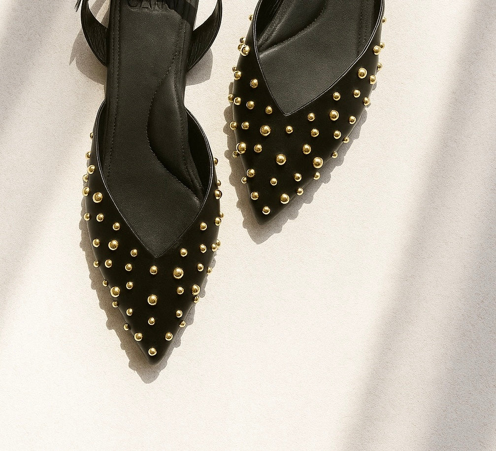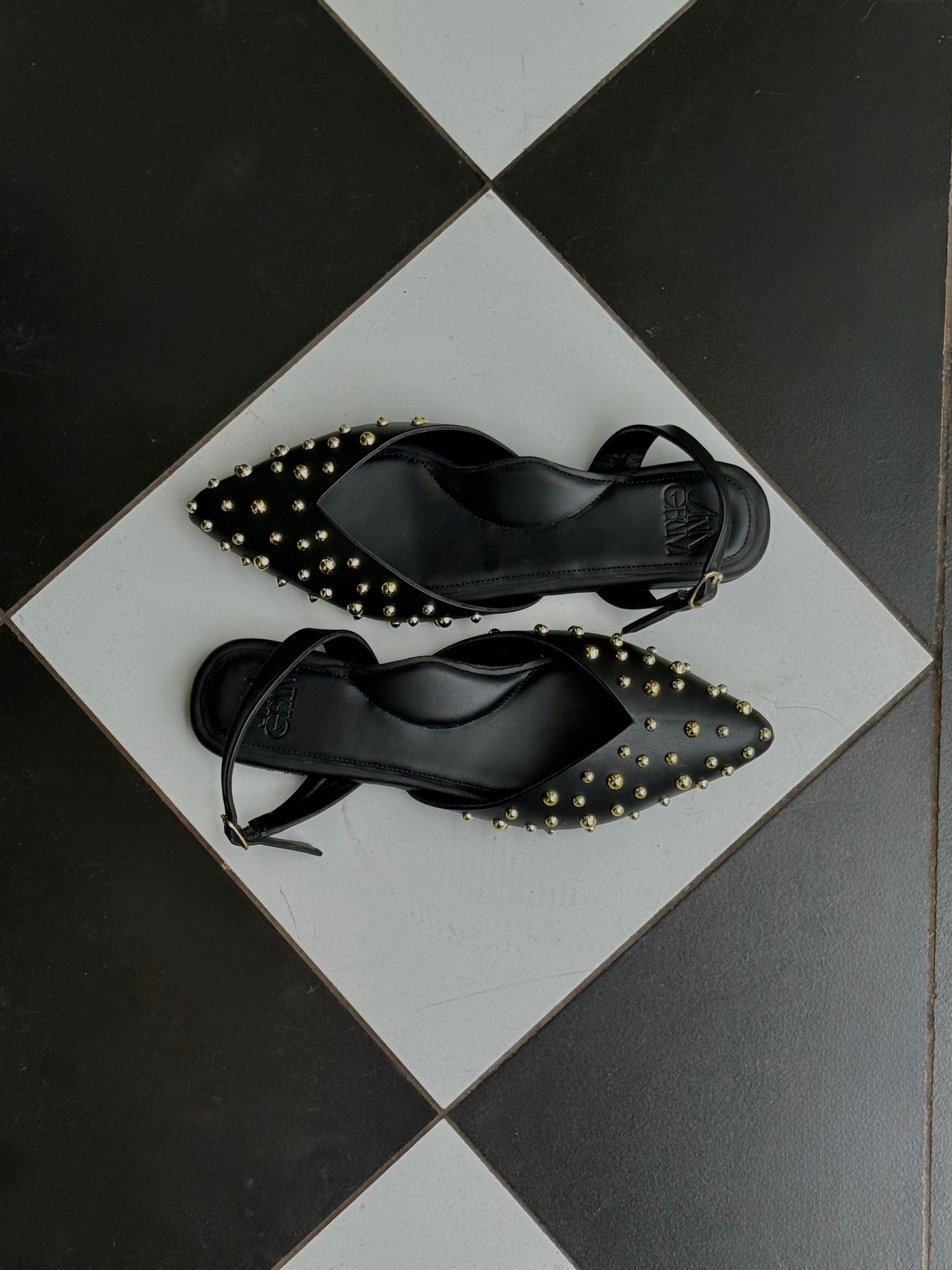 Meet our Bulletproof Slingback Ballet Flats in midnight black — where modern glamour meets unapologetic edge. Crafted from black faux leather, this pair is adorned with gleaming golden studs that catch the light with every step. The pointed toe and sleek back strap create a polished, confident silhouette that’s as bold as it is chic.