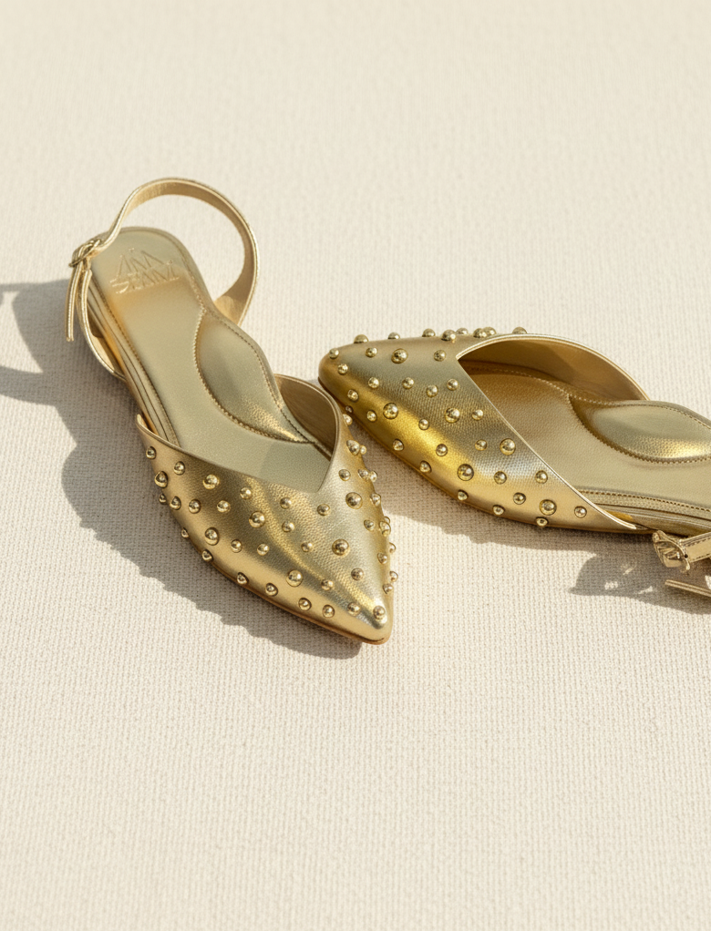 Meet our Bulletproof Slingback Ballet Flats in bright metallic Gold — where modern glamour meets unapologetic edge. Crafted from high-shine faux leather, this radiant pair is adorned with gleaming golden studs that catch the light with every step. The pointed toe and sleek ankle strap create a polished, confident silhouette that’s as bold as it is chic.