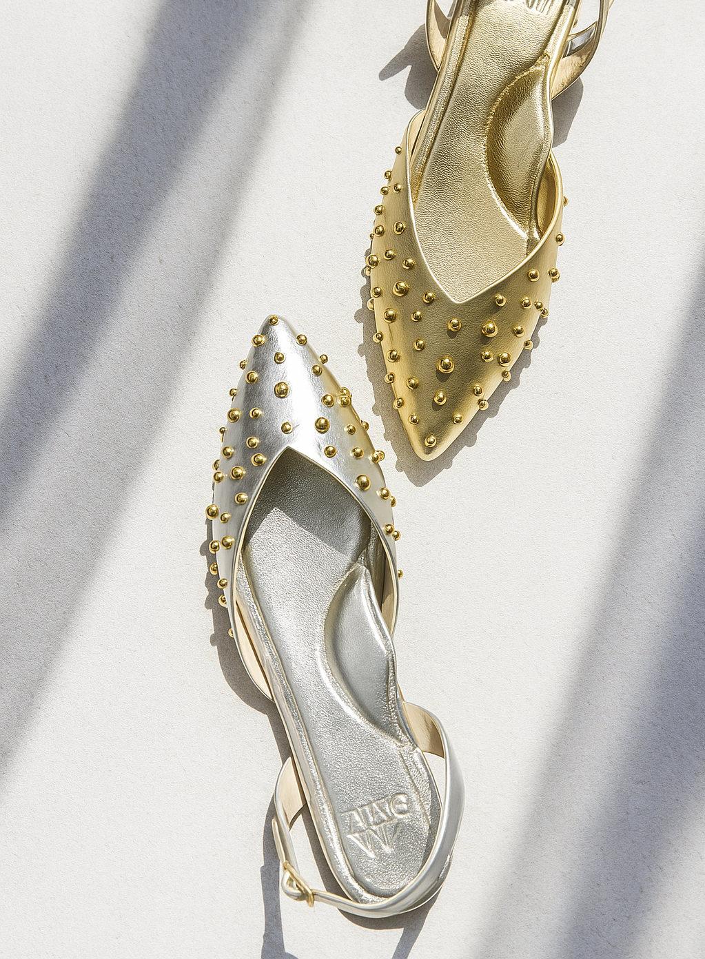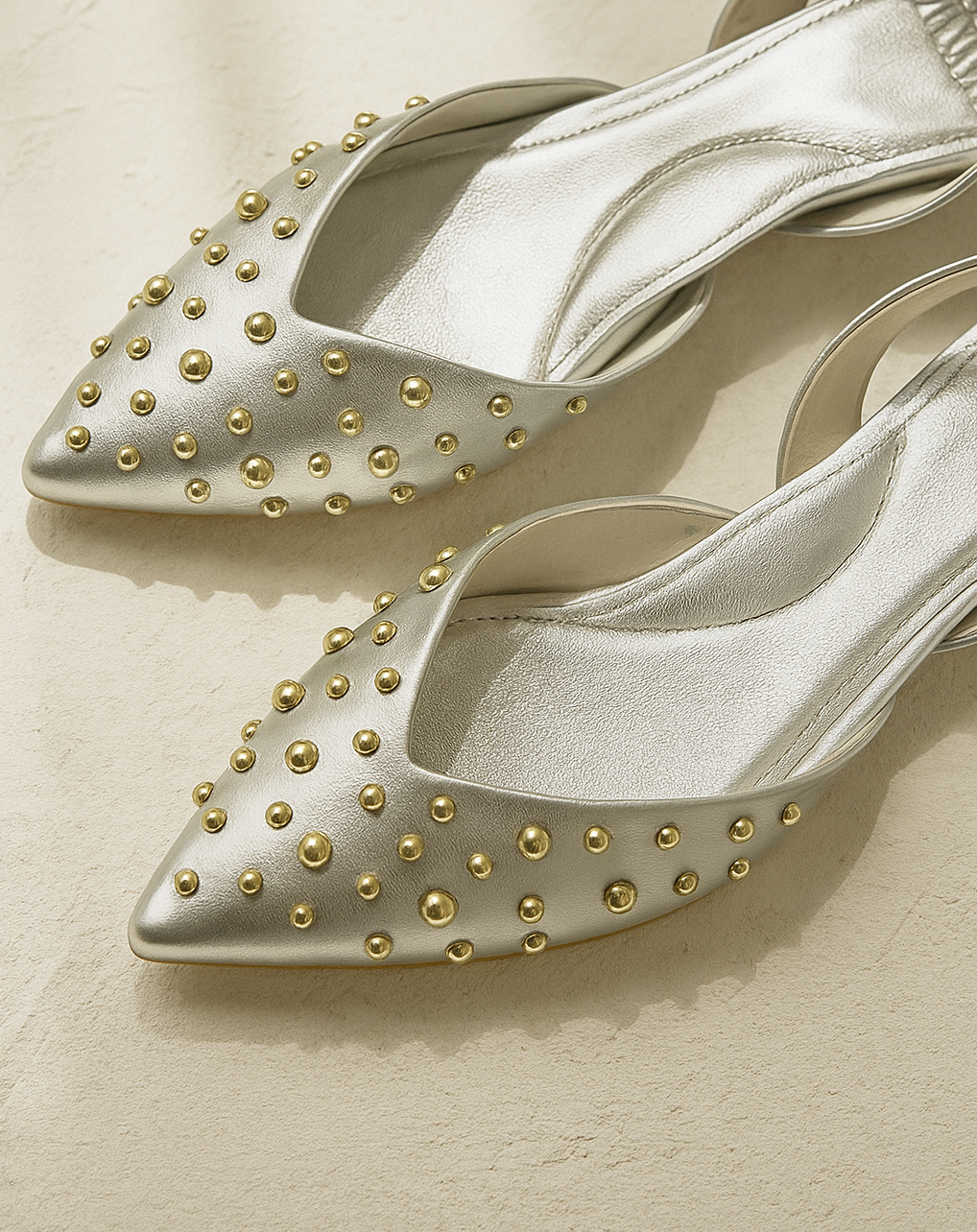 Meet our Bulletproof Slingback Ballet Flats in dazzling silver — where modern glamour meets unapologetic edge. Crafted from high-shine faux leather, this radiant pair is adorned with gleaming golden studs that catch the light with every step. The pointed toe and sleek ankle strap create a polished, confident silhouette that’s as bold as it is chic.
