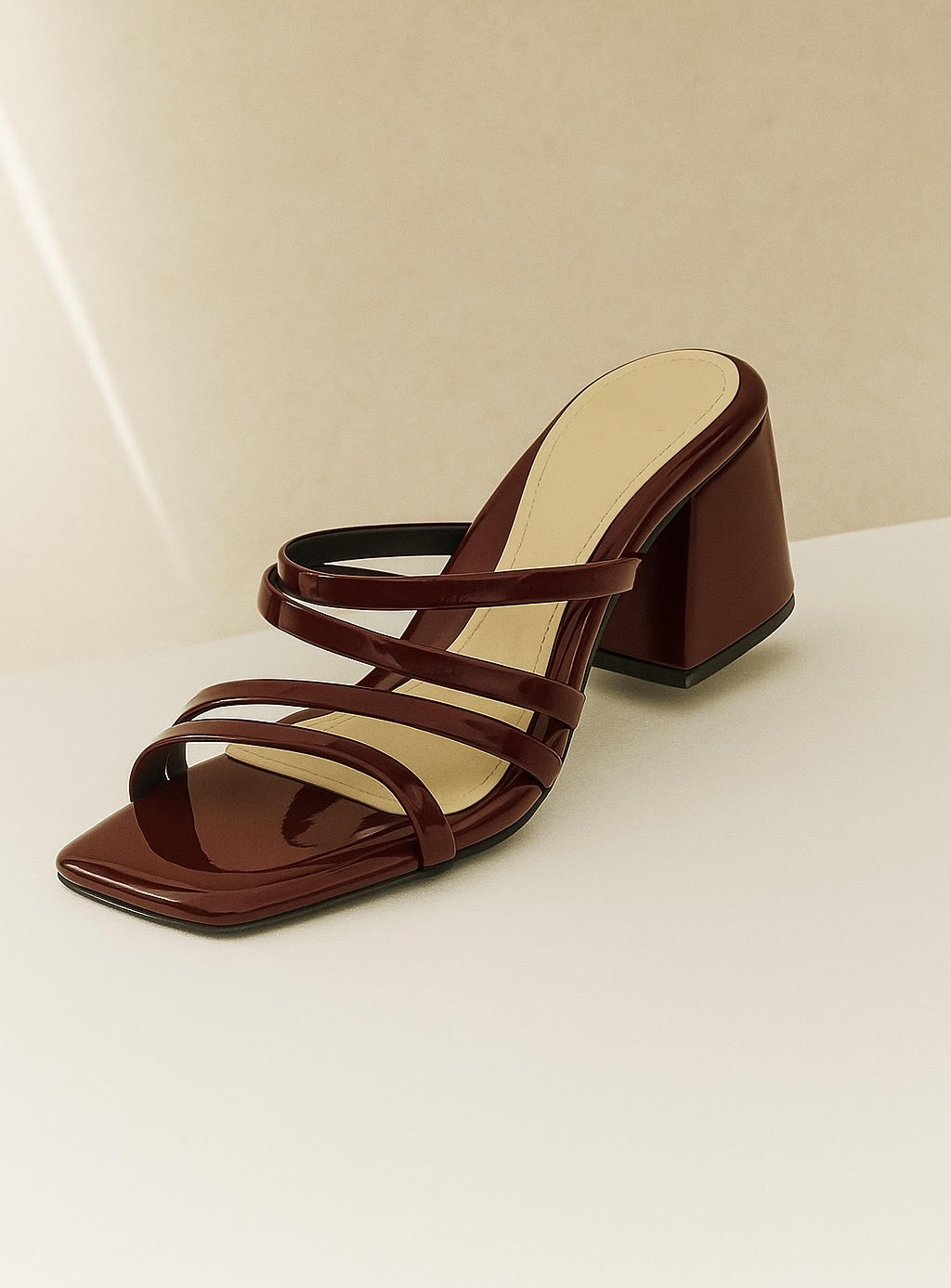 Designed to stand out without saying a word, our strappy block heels in rich burgundy bring confidence to any look. These strappy patent finish block heels in rich burgundy are crafted from smooth vegan leather and designed for all-day ease. The 2-inch block heel offers a comfortable lift, while built-in arch support and high-density cushioning ensure long wear without discomfort.